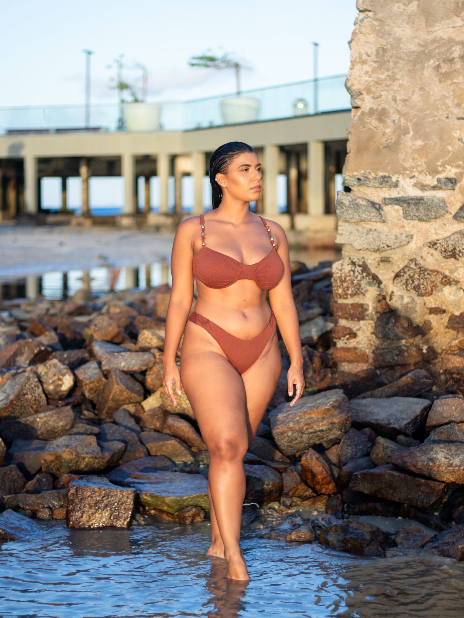 Biquíni meia-taça com os aviamentos banhados à ouro, lycra texturizada, alças ajustáveis e calcinha asa delta.